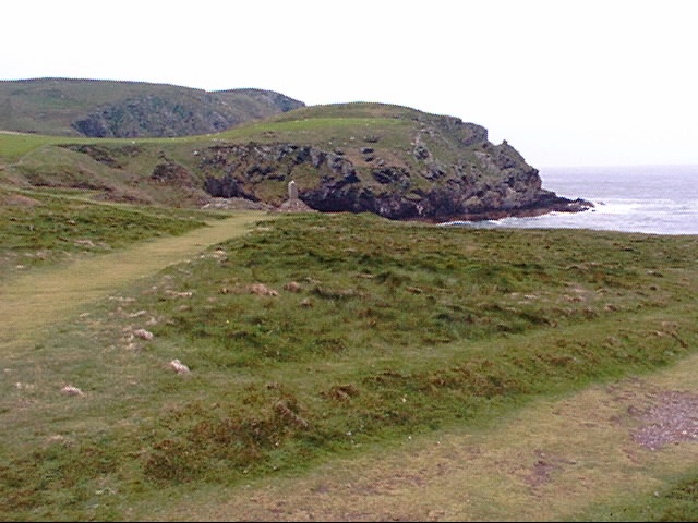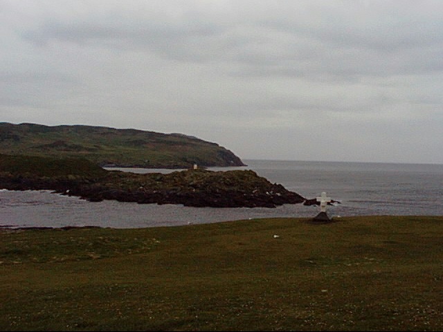 - iom29.jpg This is the South end of the island, you can see another island, the Calf of Man in the background - the currents were treacherous around here and there were quite a few shipwrecks; hence the cross/monument.